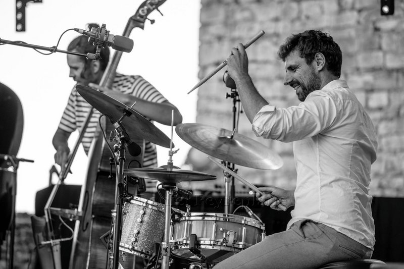 La septième édition du Poët Laval Jazz/s Festival démarre de fort belle manière avec l’EYM Trio, dont la musique est présentée par Roland Corbelin comme inventive, énergique et colorée. Que ces termes sont bien choisis pour ces compositions imprégnées de chaleur méditerranéenne, ancrées dans la culture des Balkans, ouvertes vers les horizons lointains de l’Orient (Moyen et bien au-delà) aux vastes étendues des ambiances scandinaves. Chaque composition est une histoire en soi, succession de mélodies, harmonies et rythmes hyper structurés, déambulations rêveuses et larges plages d’improvisation. Gynkgo Biloba entame le set avec une courte mais efficace intro de Yann Phayphet à la contrebasse, cadencée par un léger claquement des cordes sur la touche, sur laquelle viennent se greffer une mélodie sobre et chantante au piano d’Elie Dufour, et un rythme confortable à la batterie tenue par Marc Michel. Tout ronronne, mais pas pour longtemps. On remarque bien quelques entorses à l’harmonie, quelques notes qui ne sont pas forcément dans le catalogue et quelques syncopes qui sortent de la cadence que l’on croyait installée. Un petit unisson entre la contrebasse et la main gauche du pianiste, et les loustics n’y tiennent plus, ils lâchent les rênes. Place au déferlement d’énergie sans se départir d’une finesse de tous les instants. Ambiance moins festive pour Pique-nique à Tchernobyl, qui réussi à retranscrire à la fois la peur, la colère, l’espoir, la vitalité de la nature qui reprend le dessus. Mais il y a définitivement quelque chose de déréglé dans les airs, comme une fêlure qui marque l’irréparable. Le morceau se termine comme une sorte de résignation, avec en fond sonore le grondement du vent dans les micros. Tout un symbole.