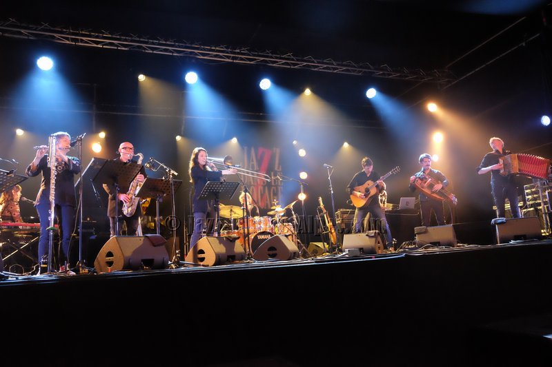 Les improvisations circulent entre les musiciens, chacun a sa place et je ne parlerais pas d’écoute mais de partage. Plusieurs moment de retraits discrets des musiciens laissent la place à différents duos toujours soutenus par la batterie et notamment un échange d’une énergie incroyable entre Guillaume Schmidt au soprano et Janick Martin à l’accordéon diatonique. La synergie est telle qu’il m’est impossible de parler de chaque instrumentiste séparément tellement l’émotion est présente (jusqu’aux larmes) et je ne peux que me laisser imprégner par le bonheur de l’écoute. Aux clarinettes, Fred excelle, la clarinette basse se transforme entre ses mains en sopranino et sa maîtrise du souffle continu lui autorise les plus grandes audaces. Aux flûtes Anne Colas nous fait vibrer avec une présence et un son incroyable doublé d’un sourire qui en dit long sur son plaisir de jouer avec Le Maxiphone. Que ce soit à la guitare, à la mandoline ou à la voix, Maarten Decombel nous enchante également. Et que dire du jeu de la tromboniste Rozann Bézier qui fait corps avec son instrument, mène d’une main de maître les départs de ses acolytes et improvise à merveille. Quant à Ömer Sarigedik très discret mais si présent aux machines électriques, avec des basses profondes et puissantes sur son pad, et à la basse. Le groupe fait un tout et il est inimaginable d’enlever un seul élément de cet ensemble sans en déstabiliser l’équilibre parfait.