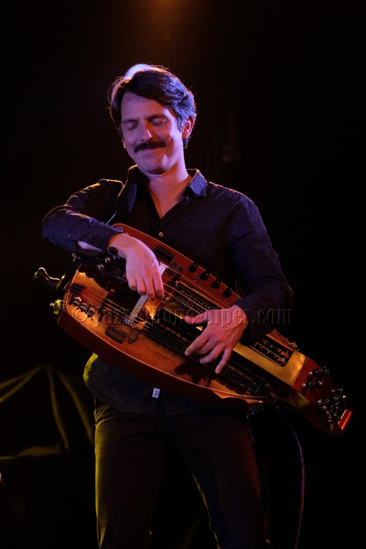 Nous sommes partis pour un incroyable voyage sans interruption au milieu de chants d’oiseaux, de souffles et bruitages de la part des dix instrumentistes, Benoît Michaud aux manettes de sa vielle à roue lançant des appels dans la forêt. Il va nous faire découvrir son instrument tout au long du concert sous un angle bien différent de ce que nous avons l’habitude d’entendre, avec des sons fabuleux de cordes pincées et autres. Adrien Chennebault volette sur les toms, cymbales et percussions de sa batterie. C’est pratiquement le seul à ne jamais s’arrêter tout au long du set, d’une régularité et précision implacable, et, chose rare pour un batteur, il respire entre chaque phrase jouée. Le morceau se poursuit dans une envolée de tous survolée par la voix magique de la pianiste Maïlys Maronne, qui passe du clavier au piano faisant suivre son micro, l’œil et l’oreille toujours en alerte prête à tout, et aux improvisations généreuses et puissantes. Nous voilà envoutés par la beauté des harmonies tantôt classiques avec des bribes de gigue, gavotte, tantôt à la limite de la dissonance d’une beauté implacable. La mise en place est plus que parfaite, la communion est présente, une complicité évidente règne au sein de l’orchestre, des sourires s’échangent. Nous sommes au cœur d’une musique vraiment vivante et vibrante.
