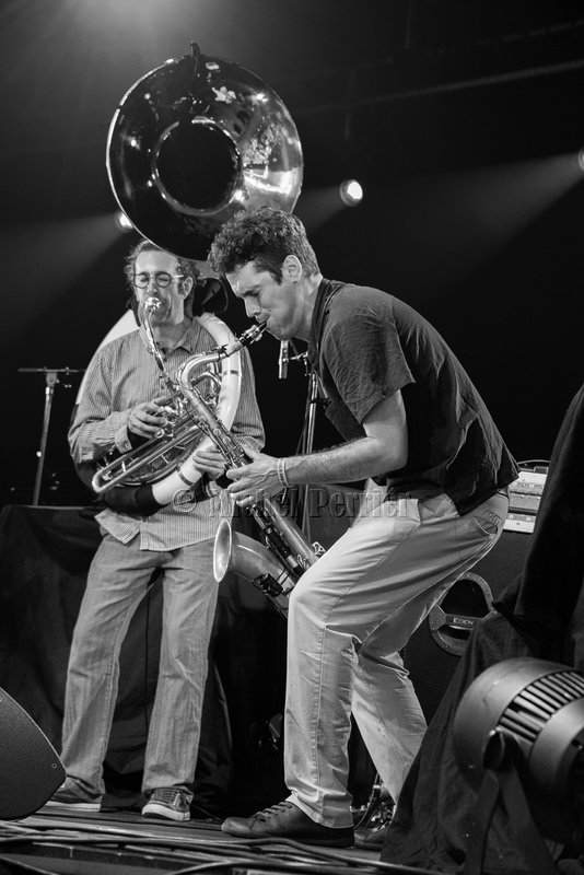 Froggy Beat (tempo de la grenouille), clin d’œil aux anglais, démarre sur un duo saxophone ténor et baryton joué par Franck Pilandon, l’un pose une note continue et l’autre joue la mélodie. Pierre Larrat quant à lui entame une basse continue sur son sousaphone en respiration circulaire. Adrien Daguzon se joint à eux avec son alto et son ténor qui joue la mélodie et servira à la première improvisation, accompagné par le baryton, le sousaphone et un jeu tout en finesse d’Antony Miranda à la batterie. Le set commence vraiment bien, ces musiciens sont très bons et vont nous ravir les oreilles.