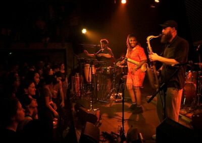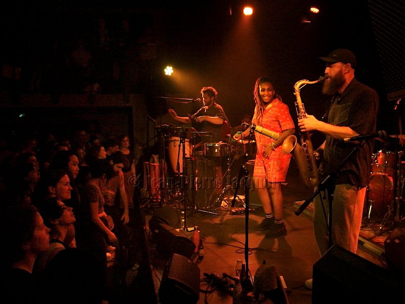 Dans ce melting-pot savamment dosé de nombreux styles très actuels, tous venus de différentes cultures mais qui ont pour point commun de nous mettre en état de teuf, le hip-hop rappé de So Mi Stay se nourrit de reggae et de funk et fait courir son onde jusqu’au balcon lui aussi transformé en dance-floor et où s’élève le solo de trompette posé par Jonny Enser. Et ce n’est certainement pas l’afrobeat tonitruant de Carry Me -où c’est cette fois le sax ténor qui vrille en chorus- qui va faire redescendre la température, boostant encore ce groove infernal sur sans doute la plus grosse tuerie du set, avec Woman et son electro-groove syncopé qui tombe grave.