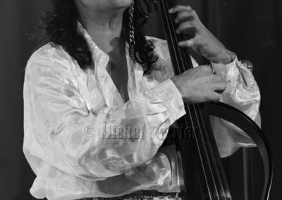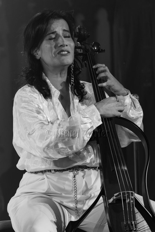 Tous les morceaux sont des compositions de Nesrine qui présente son violoncelle électrique comme son amant, plus flexible que son mari de 1910 resté à la maison !!! Ce nouveau titre Bonnie et Clyde, qui sera sur son prochain album en duo (Clyde, violoncelliste également n’est pas présente ce soir) est chanté en français accompagné sur les cordes de son violoncelle avec toujours le soutien des percussions et de la voix d’Anissa et une très belle improvisation au chant de Nesrine.