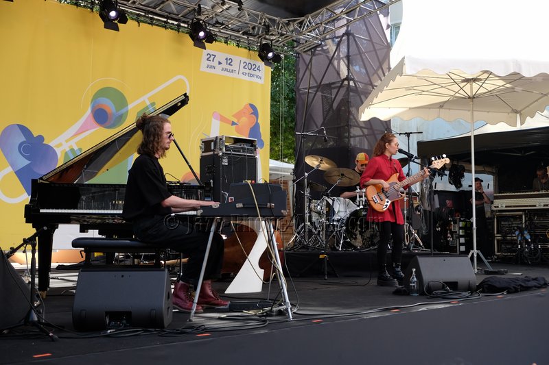 Julia Richard arrive sur scène avec sa basse électrique et s’empare d’emblée du micro pour un rapide bonjour avant de lancer son set. Elle chante (en anglais) avec un bel aplomb.Elle alterne avec sa contrebasse qui semble bien trop grande pour sa frêle silhouette, qu’importe, elle maîtrise.