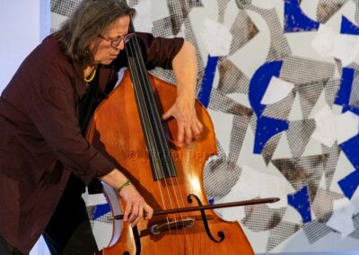 Joëlle Léandre sculpte le son, de l’archet, de la voix, des doigts, caresse les cordes pour se jouer des harmoniques, les malmène pour en tirer des sons amples, pleins et droits, martèle le corps de l’instrument pour des effets polyrythmiques élaborés. Elle lance une figure sonore, tourne autour, l’ajuste, s’engouffre dans des prolongements fascinants, y revient pour ouvrir un nouveau chemin.