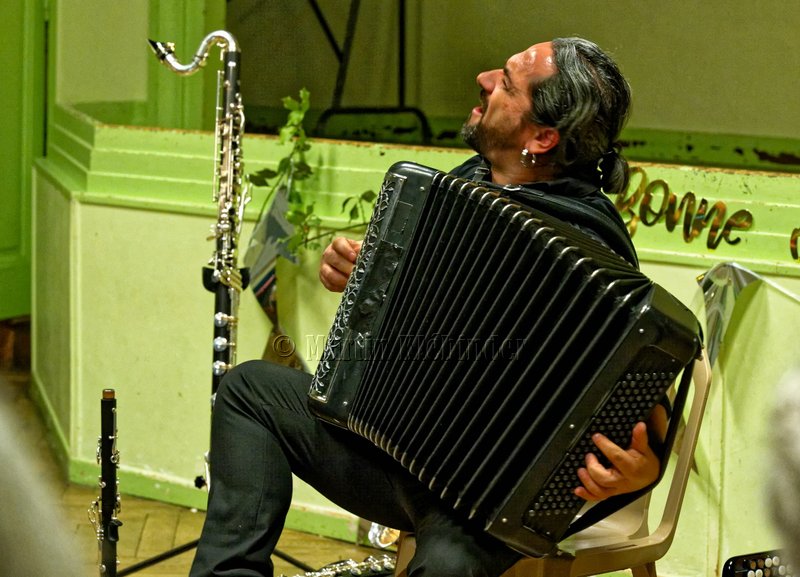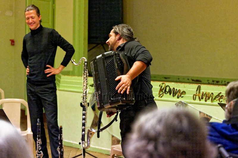 Lors de notre installation dans la salle, nous remarquons les deux accordéons de Rémy et les bois de Carjez, avec de petites percussions et une cymbalette. Ils ont souhaité être installés en bas de la scène, pour la proximité avec le public, et ils arrivent d’ailleurs par la salle avec un arrangement d’Oblivion mêlé à Fou rire de Richard Galliano pour nous immerger dans leur musique : partage des sons ; rapidité, fusion des thèmes, Rémy chante, Carjez utilise la cymbalette, les petites percussions évoquant le son du bâton de pluie… et le morceau se termine à la clarinette.