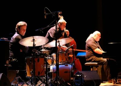 Un superbe solo de contrebasse à l’archet avec quelques touches de cymbales, rajout du piano, comme une discussion qui s’enflamme et semble un peu décousue, comme c’est parfois le cas devant une « eau »… puis ils finissent par tomber d’accord… et quel accord ! Ils sont beaux à voir : les trois hommes sont de noir vêtus, la queue de cheval blanche reconnaissable d’Andy, la petite boucle d’oreille de Claude scintille élégamment selon ses mouvements et l’éclairage et les cheveux bien peignés d’Eric qui partent en bataille au fur et à mesure du concert. Décoiffant.