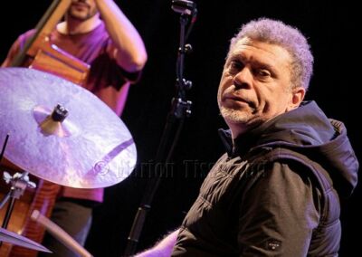 Après cet élan militant nécessaire et salutaire les spectateurs sont ensuite invités dans le hall du Théâtre pour fêter dignement et avec deux gâteaux s’il vous plait (un pour chaque chiffre de l’anniversaire), ce quart de siècle du festival ; une belle fin pour une journée festive commencée sur le marché de la ville, et qui a également célébré le jazz avec une étape en Mairie à l’heure méridienne pour le vernissage d’une formidable exposition. Permettez-moi ainsi, une fois n’est pas coutume, un spécial « copinage » avec la mention de l’exposition de photos de concerts pour les vingt-cinq ans du Festival qui se tient durant la manifestation jusqu’au 31 janvier, dans trois lieux de Saint-Fons : l’Atrium de l’Hôtel de ville, Le Théâtre Jean Marais, et l’École de musique. Cette exposition rétrospective propose le regard sur les différentes éditions par les plus talentueuses et talentueux photographes de la constellation de notre association Jazz-Rhône-Alpes.com, à savoir : Marion Tisserand (également commissaire et cheville ouvrière de l’exposition), France de Stéfanis, Christophe Charpenel, Didier Martinez, Jean-Pierre Jacquot, Gérard Brunel et last but not least, Pascal Derathé (un peu « vraitographe » à ses heures !)