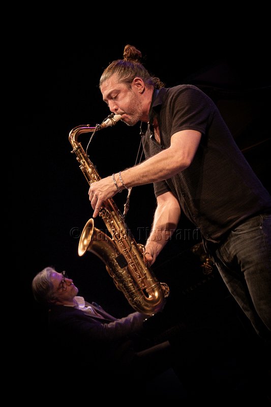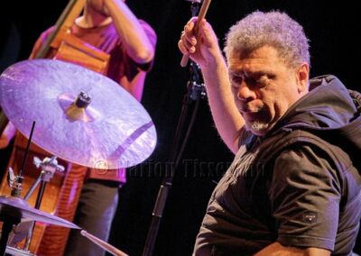 Il présentait à Saint-Fons son nouveau Quartet (The Swan and the Storm) car selon ses dires « nouveau cela fait plus chic, même s’il n’y a jamais eu de Old Quartet » ! Ce nouveau groupe met en lumière Guillaume Perret au saxophone ténor, une fois n’est pas coutume, dans un registre purement acoustique qui lui réussit formidablement bien. C’est l’apanage des grands d’être à l’aise dans tous les styles et configurations. Le premier morceau traduit par Mirabassi par « je doute toujours » installe la formation qui produit un jazz réjouissant affichant une belle complicité entre ses membres. Le morceau qui suit est dédié au pianiste américain Fred Hersch, Red for Fred. Et, notre Giovanni de préciser que toutes les compositions sont de lui, dont Cinquantuo et Getting Nasty. Perret se montre déchaîné de bout en bout avec des élans puissants. Les belles ballades, marque de fabrique du pianiste sont également présentes comme le titre éponyme du dernier album The Swan and the Storm pour lequel Mirabassi raconte l’histoire touchante de cette jeune femme danseuse connue à Odessa avec le confinement et qu’il fera venir en France au moment de la guerre en Ukraine. Cette explication rappelle que le compositeur est aussi un artiste engagé et ce n’est pas le rappel qui démentira cette caractéristique, mais nous n’en sommes pas encore là…Mirabassi est par ailleurs engagé dans la défense de la création musicale comme ce plaidoyer pour l’achat de disques le révèle : le pianiste annonce fièrement que l’an dernier il a fait un million de vues sur Spotify mais que cela ne lui a rapporté que dix-sept euros ! Il vante les mérites de l’achat de son dernier disque qu’il présente au public et du support album matériel en général. Il loue également à ce propos la belle couverture de son disque faite par un de ses amis de renom, Mangaka. Puis, profitant du départ de la scène par ses comparses, il improvise au piano solo un hymne anniversaire au Saint-Fons Jazz en lui souhaitant encore au moins vingt-cinq ans d’existence, voire plus. Le groupe enchaîne, sans son saxophoniste, un morceau dansant permettant au batteur cubain Lukmil Pérez de s’illustrer sur sa jazzette qui en a oublié son tom médium… Mais c’est déjà le moment de rappeler le quartet pour un Chant des partisans du plus bel aloi, endiablé et plein de fougue. Giovanni Mirabassi confie que « cela fait vingt-cinq ans qu’il joue et que c’est toujours autant la merde [politiquement] ! ».