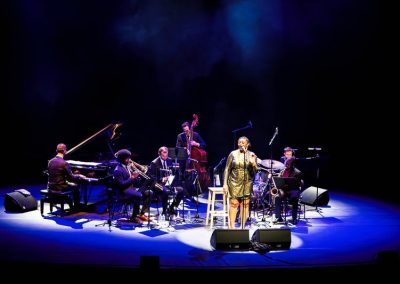 Sans doute pour retrouver les mêmes dispositions qui ont prévalues à l’enregistrement du disque, -à savoir des conditions live avec les sept instrumentistes réunis tous ensemble dans une petite pièce-, les Young Lions en question sont ramassés en un pack serré sur le grand plateau où ils entament le set, tous très smarts en costard-cravate. Le temps que la chanteuse, plantureuse dans sa robe courte en strass, les rejoigne d’un pas tranquille, et l’on reconnaît l’inévitable Around Midnight en ouverture où déjà, les variations d’amplitude de ses vocalises et son sens inné du swing coulent de source, sous l’apparence d’une élégante décontraction. Un sens du timing surtout, et du feeling aussi, comme dans le jeu de distance avec le micro, pour mieux accentuer chaque nuance, tel qu’elle le fait sur Beware my Heart, au groove porté par la contrebasse de Paul Sikivic. Une ligne solide donnant l’occasion d’un solo de flûte jouée par le sax ténor Kendric McCallister, suivi d’un chorus du trompettiste Jason Charos, tandis que la maîtresse de maison n’hésite pas à s’effacer dans l’ombre en emportant même son pied de micro pour laisser ses solistes prendre la lumière, notamment son pianiste Connor Rohrer.