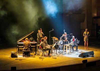 Une voix enchantée dont le phrasé oscille souvent quelque part entre les musicals et le lyrique, ajoutée au swing orchestral des Young Lions qui s’envolent comme encore sur Little Things, et qui bénéficie d’un tempo batterie/contrebasse aussi métronomique qu’un balancier à l’image de Little Karin, il n’en faut en effet, pas plus pour fondre de plaisir et de joie. Avec en feu d’artifice vocal un impressionnant scat en fréquences hautes pour conclure le set par un No more Blues plus latino où rutilent les cuivres, avec notamment un dialogue enlevé entre trombone et trompette. Et, c’est un blues plus boogie cette fois qui entraînera le public -une fois qu’il soit raccord dans le tempo de ses claps, c’est mieux…- qui sera offert en rappel avec Mental Phrasing.