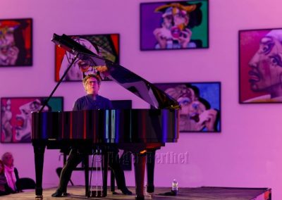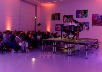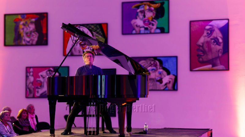 Le concert se déroule au fond de la galerie stéphanoise Ceysson & Bénétière. Tout est blanc, hormis, sur les murs, les installations hyper colorées de la plasticienne ORLAN. Des visiteurs du soir s’y baladent, croisant parfois au détour d’une œuvre un homme humble, discret, aimable, souriant. C’est le pianiste Harold Charre qui papote de-ci-de-là, disant qu’il « habite Bordeaux, comme tout bon parisien ». Peu le connaissent alors, sauf celles et ceux qui, en l’église de Cellieu, avaient déjà reçu une première décharge extatique (voir ici). Il est vrai que son parcours de concertiste solo est assez récent, ses créations musicales ayant surtout servi de support aux très nombreuses vidéos d’art qu’il a réalisées et pour lesquelles il a reçu des prix majeurs. Il est donc quelque peu débutant en la matière, mais de moins en moins, jouant régulièrement sur les scènes parisiennes et dans des festivals, tels le Rhino. Entre les deux, on sent d’ailleurs un vrai coup de foudre. Quoi qu’il en soit, la musique, il connaît. Des années de Conservatoire à Lyon puis dans la capitale lui ont marqueté le phrasé.