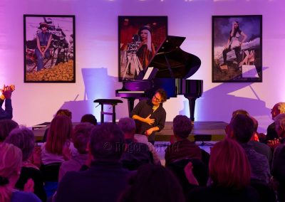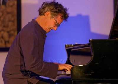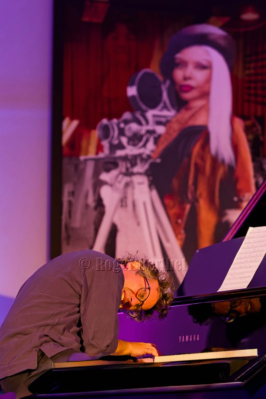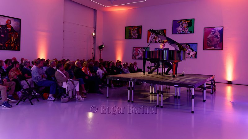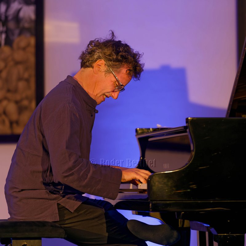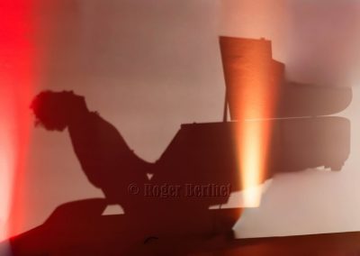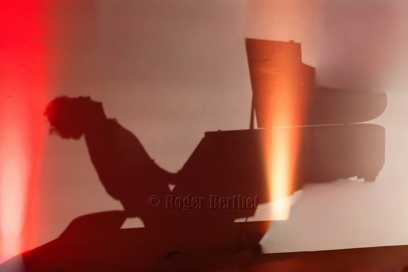 Le jazz ? Ce sont des découvertes et des influences multiples qui, peu à peu, ont forgé chez lui un jeu ressemblant à … personne. Un zeste de Keith Jarrett peut-être, une respiration harmonique subtile à la Duke. Surtout, dans les tripes, ce qui ne s’explique pas, le blues d’un être, noir ou blanc, qui cherche la lumière. Et c’est ça, ce qu’il va exprimer au fil d’un concert dont il dit au départ qu’il va «exprimer les moments sombres de ce monde ». Alors, c’est dingue, celui que l’on a croisé il y a dix minutes flânant avec bonhomie, se transforme en plusieurs autres personnes. Tiens, il est en chaussettes. Normal, quand on se met debout, pied sous le séant, bougeant non stop et s’abreuvant aux vibrations qu’on génère partout. A la matière qu’on créé. Sur le pupitre d’un piano juché en hauteur, « un régal, ce piano », dira-t-il, on aperçoit quelques papiers. Des partitions? Non, ce sont juste des indices pour les thèmes et les titres, le plus souvent des arrangements de gospels, comme Trouble of the world ou des negro-spirituals, quand on n’y croise pas du Bob Marley. Pour le reste, l’impro est totale. Les notes sont travaillées au cordeau, prenant une ampleur qui gronde ou ruisselant en arpèges limpides.