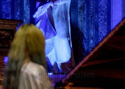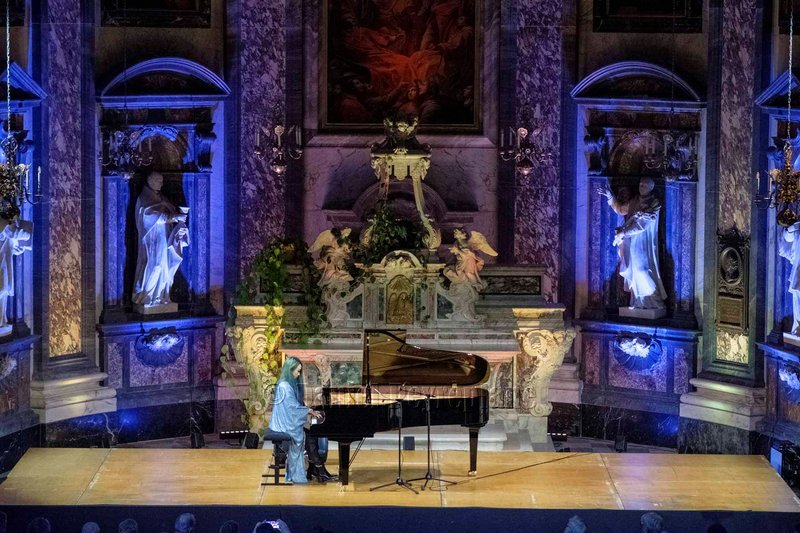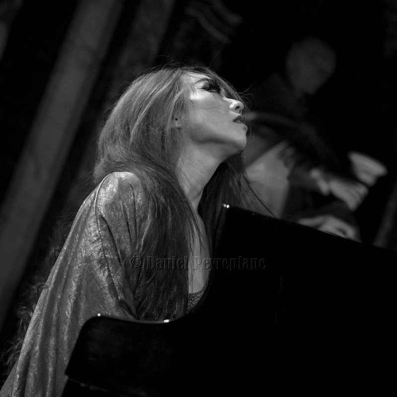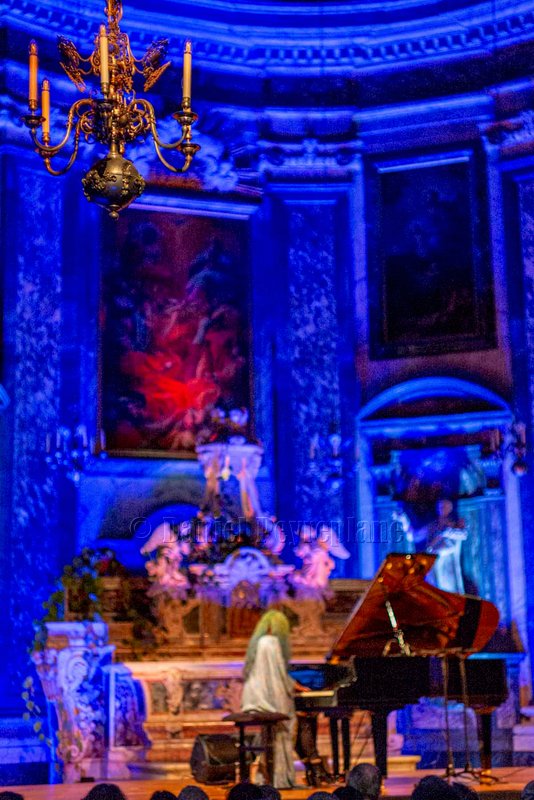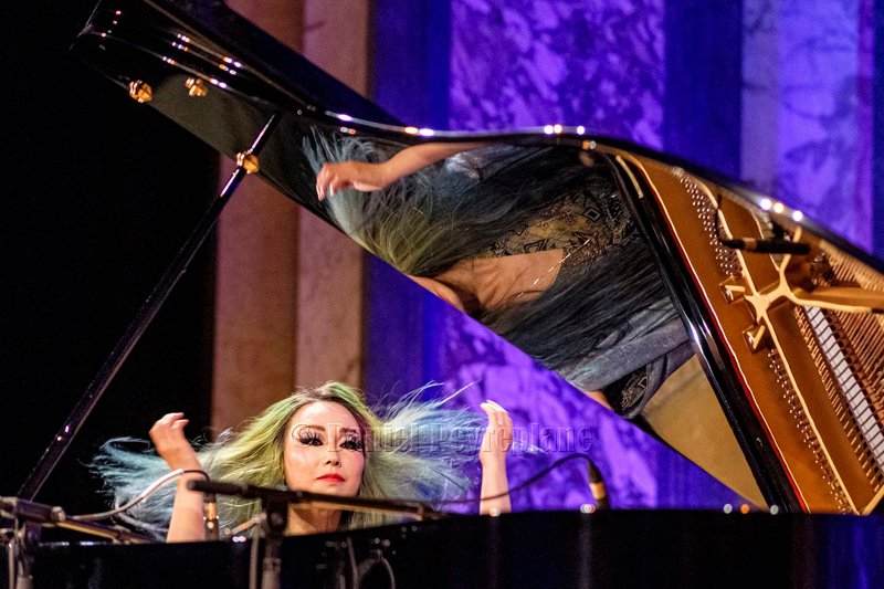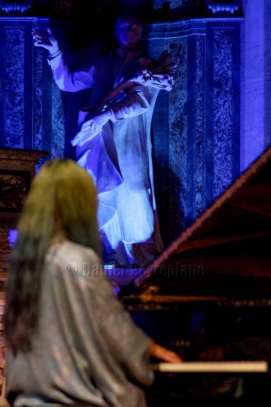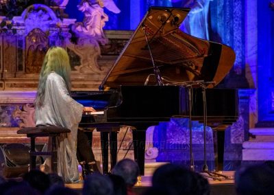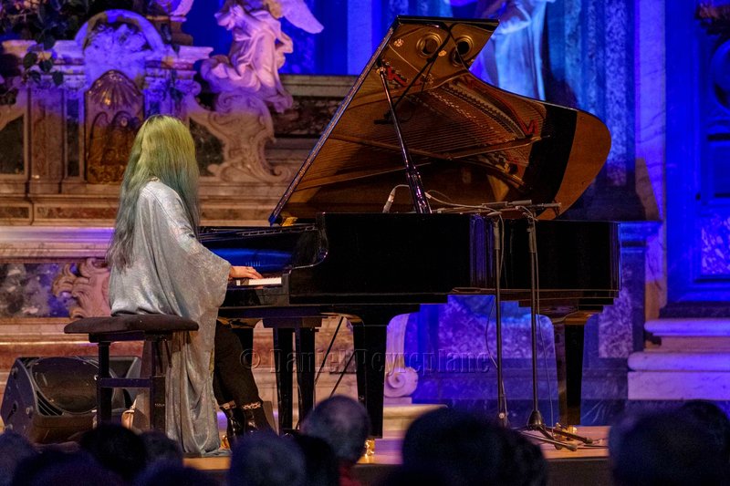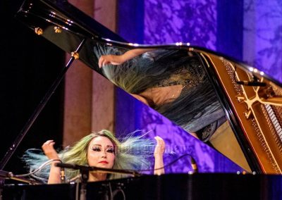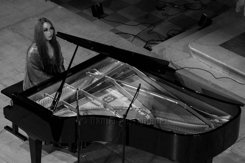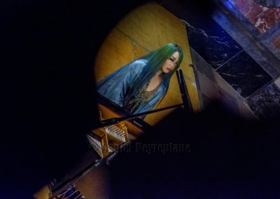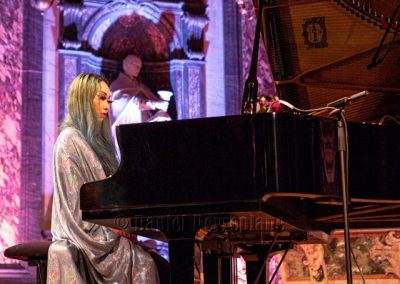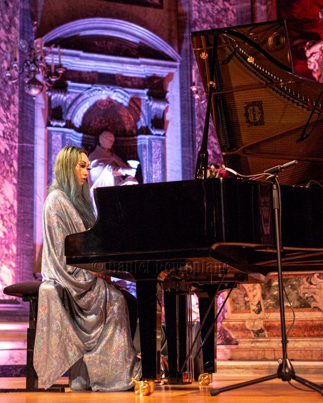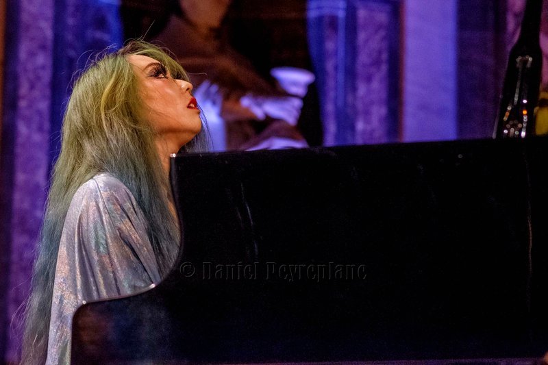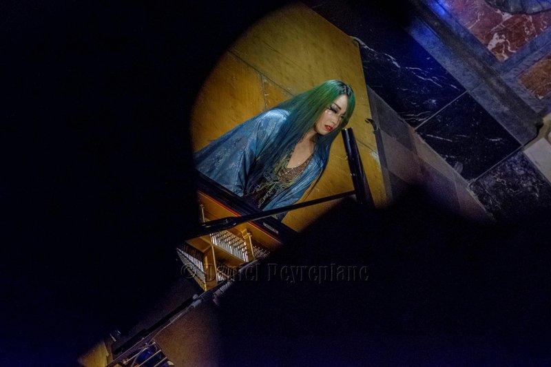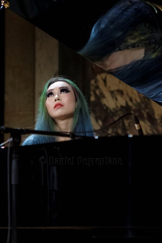 Ce magnifique écrin, même si la chapelle a été désacralisée, est parfait pour accueillir Naoko Sakata qui se présente près du piano. L’artiste nippone, qui réside en Suède, nous émerveille d’entrée avec sa présence : son visage souriant avec une bouche très rouge et deux rangées de cils surdimensionnés sous des paupières noircies et pailletées est encadré d’une longue chevelure dans les dégradés verts finissant en gris, qui aura son importance… Ses déplacements sont magnifiés par un long manteau ample et soyeux à l’imprimé pastel.