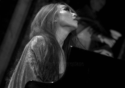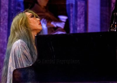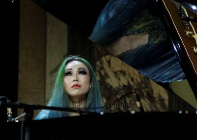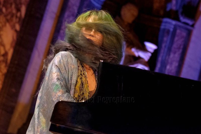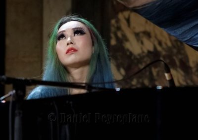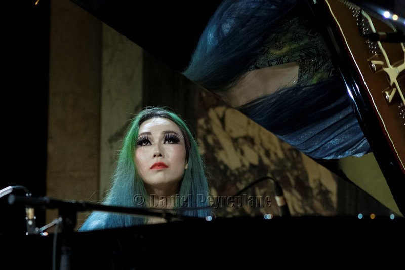 Elle finit généralement toutes ses improvisations d’une manière abrupte. Elle nous offre aussi des mélodies douces et délicates, et termine son concert par une fin apaisée. Elle revient, toujours en souriant et en courant, comme si elle avait oublié de nous dire quelque chose. Elle demande à l’organisation de couper l’amplification afin de terminer son concert en acoustique intégrale. Elle sourit, remercie toujours de sa petite voix qui peut contraster avec son jeu, et entame un ultime morceau aigu, elle tape du plat de la main, avec ses bras entiers sur le clavier, semble chercher l’inspiration et rentre dans son « personnage », secoue sa chevelure comme dans plusieurs moments du concert en spasmes violents, tape du pied, joue très vite, les notes se multiplient… et STOP ! Elle s’arrête de jouer…