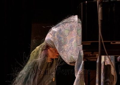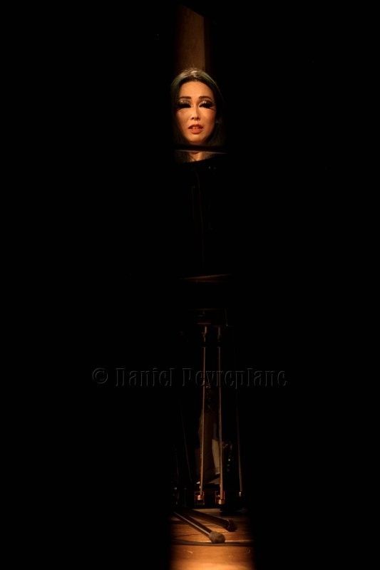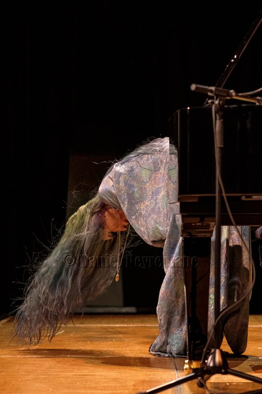 A la fin de la première pièce, elle remercie d’une petite voix fluette qui contraste avec le morceau joué. Elle entame une improvisation calme qui devient vite orageuse, elle semble communiquer (avec qui ?) en levant les yeux au ciel, pousse des cris stridents, ses chants semblent incantatoires. Le morceau suivant débute encore dans le calme puis se transforme en « foudre sonore » impressionnante. Une petite musique gaie, aiguë, les yeux levés au ciel, la chevelure tremblante, l’artiste tape des pieds, sautille sur son siège, semble toujours « guidée » et nous offre avec rapidité et rage une œuvre déchaînée ponctuée de cris stridents.