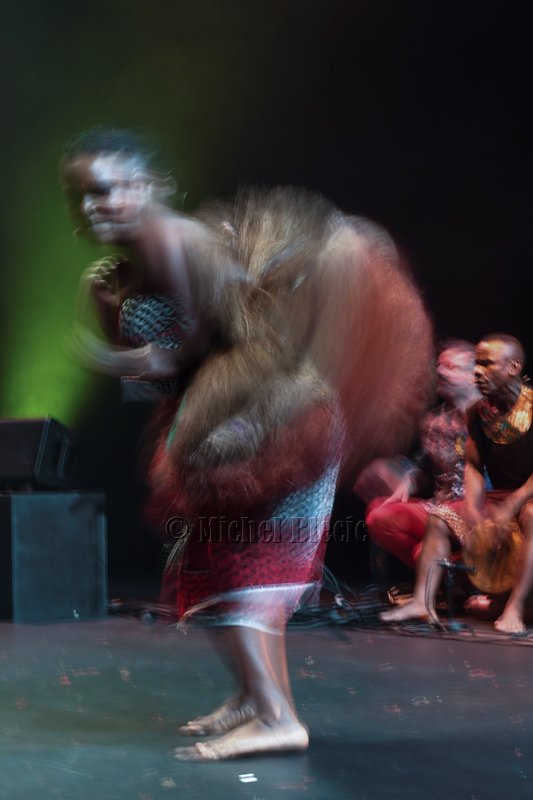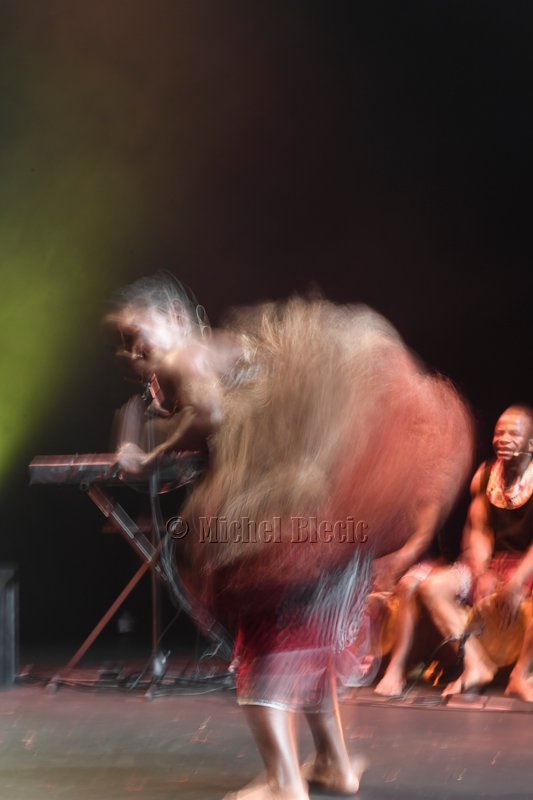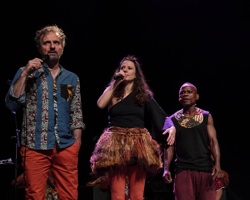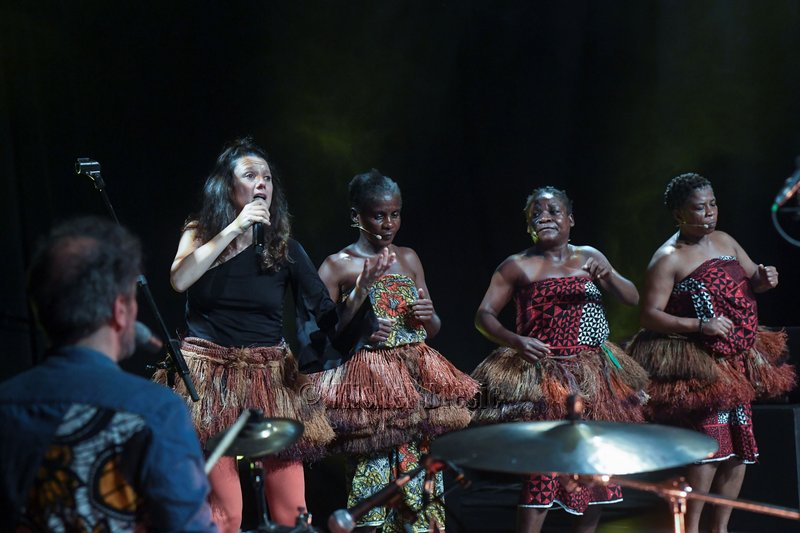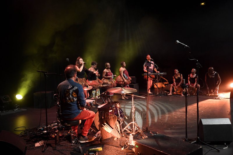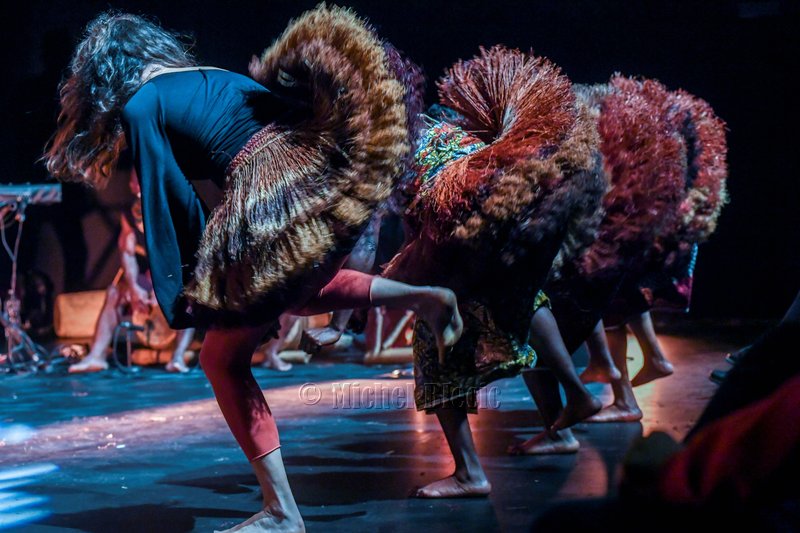 Le charme de ce concert dansé résidait dans la polyrythmie musicale et la polyphonie des chants mêlés trouvant leur unité grâce aux talents mêlés de trois chanteuses et danseuses (Angélique Manongo, Émilie Koulé et Nadège Ndzabole), deux percussionnistes et notre trio français.