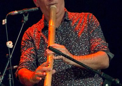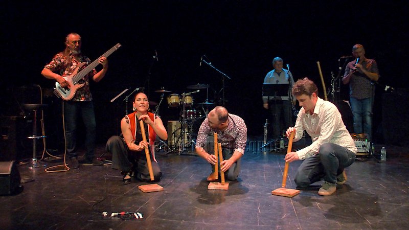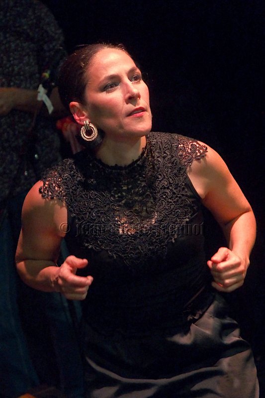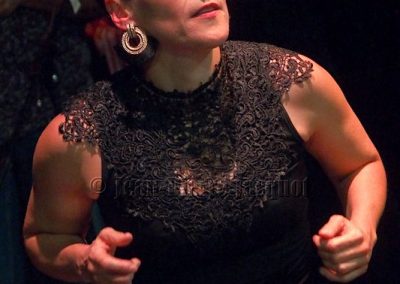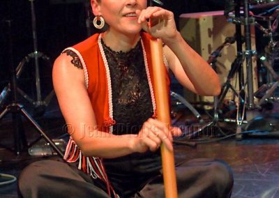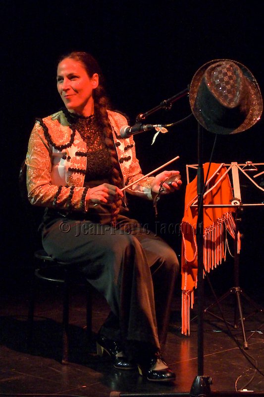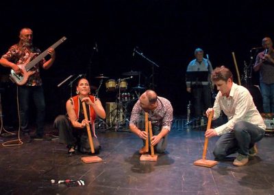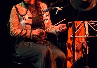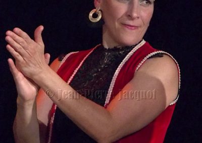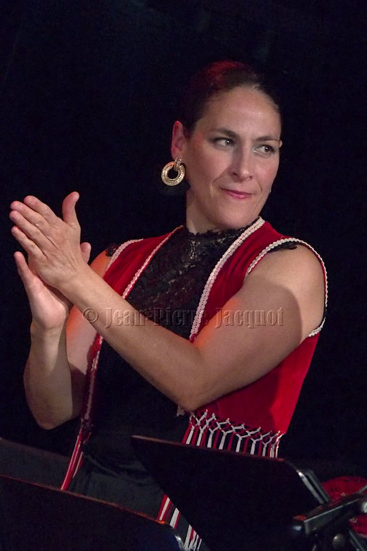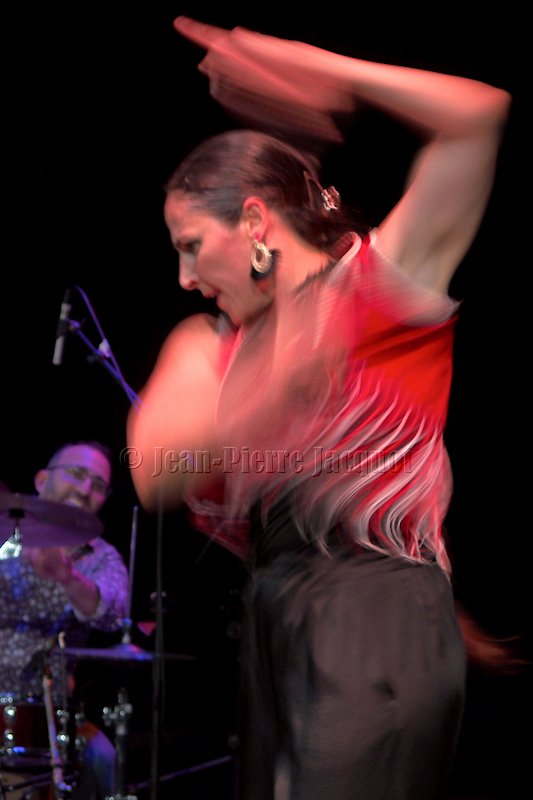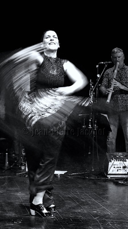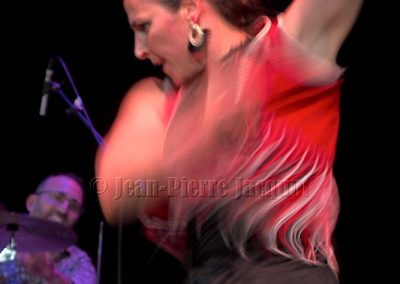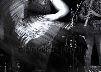 Cajon, guitare sèche, clarinette, batterie, clap des mains… la danseuse revêt un gilet rouge aux manches volantées. Liberty City… elle a mis une étole noire imprimée tandis que le shakuhachi de Jean-Luc Peilhon nous immerge dans son ambiance. L’harmonica du même Jean-Luc, la démonstration de tommettes et bâtons qui les frappent par la danseuse, le guitariste et le batteur nous immerge dans un autre univers que les afficionados connaissent grâce aux kitiplas du maître percussionniste vénézuelien Gustavo Ovalles, venu nous les présenter à plusieurs reprises dans la région…