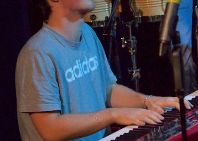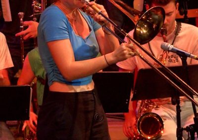 Après une brève introduction, le big band s’installe, dirigé par Hervé Salamone, trompettiste lyonnais qu’on ne présente plus. Le groupe est composé, à cour, d’une section cuivres (quatre trompettes, quatre trombones, cinq saxophones), à jardin d’un clavier Nord Stage 3, d’une guitare électrique entourant une contrebasse (remplacée quelquefois par une basse électrique) devant une batterie et des percussions diverses.