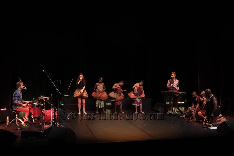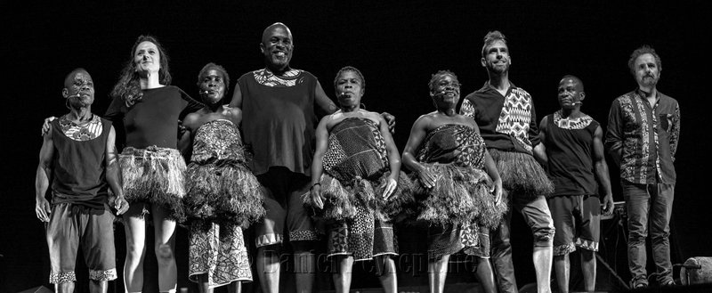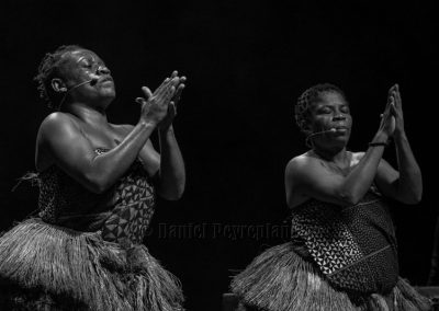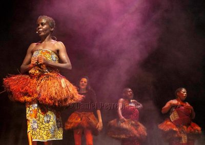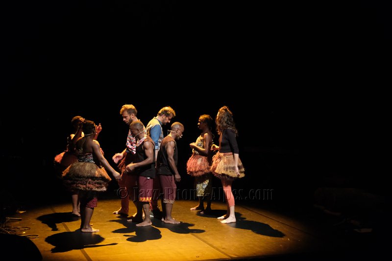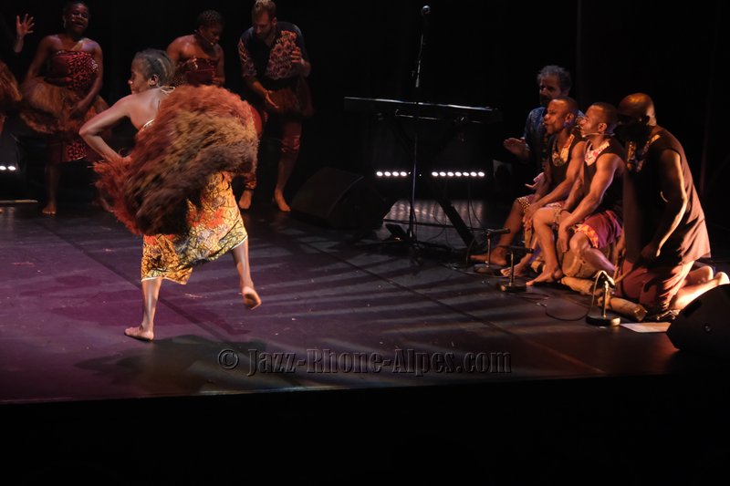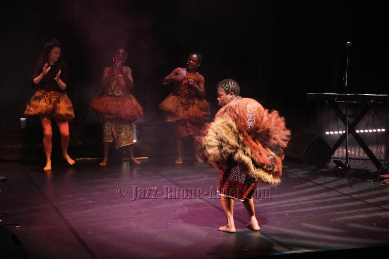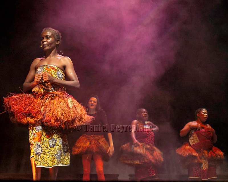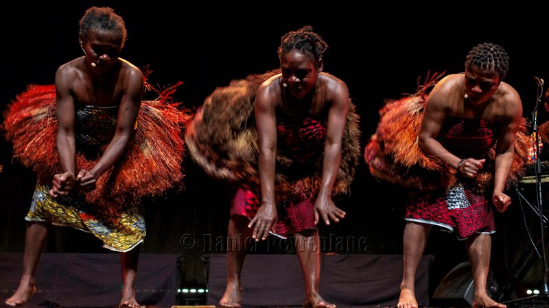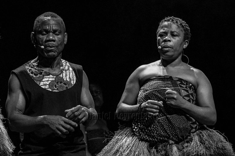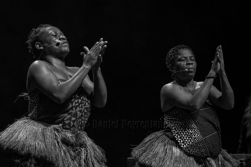L’Ensemble Ndima (la Forêt en langue aka), créé il y a plus de vingt ans au Nord du Congo Brazzaville dialoguera ce soir avec Leïla Martial, Rémi Leclerc et Éric Perez, groupe occitan. Angélique Manongo, Émilie Koulé et Nadège Ndzabole, les trois chanteuses-danseuses du groupe du « peuple héritier » du Congo se présentent vêtues d’un pagne coloré et arborent une ceinture à trois étages composée de fils de tissu semblable au raphia. Les trois hommes percussionnistes-chanteurs, Gaston Motambo, Michel Kossi et Sorel Eto sont vêtus de costumes traditionnels. Leïla Martial sera aussi ceinte d’une ceinture de même type moins volumineuse.