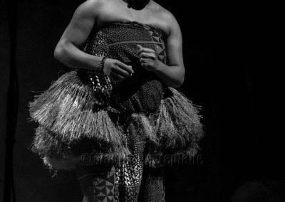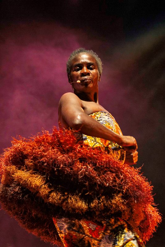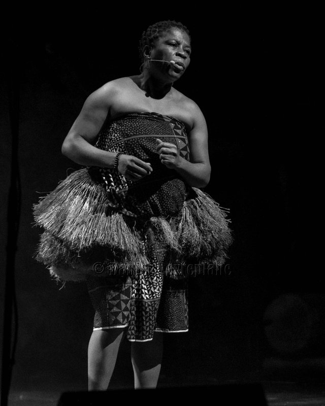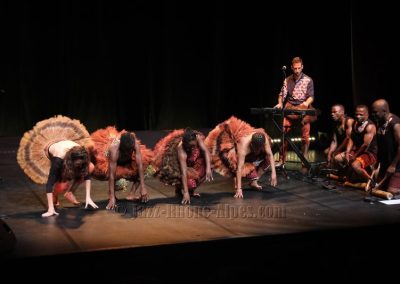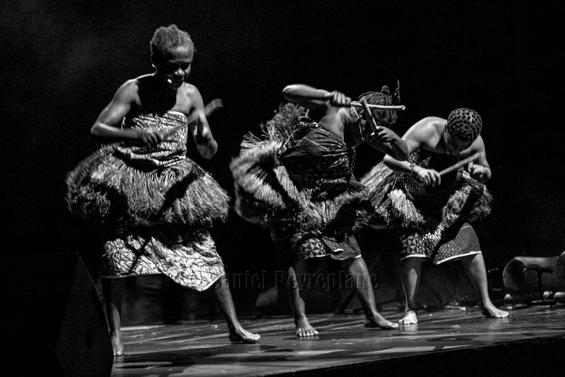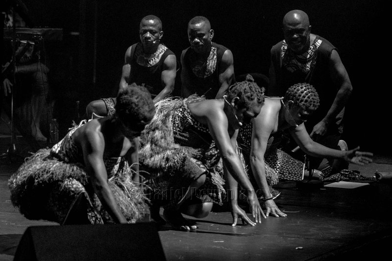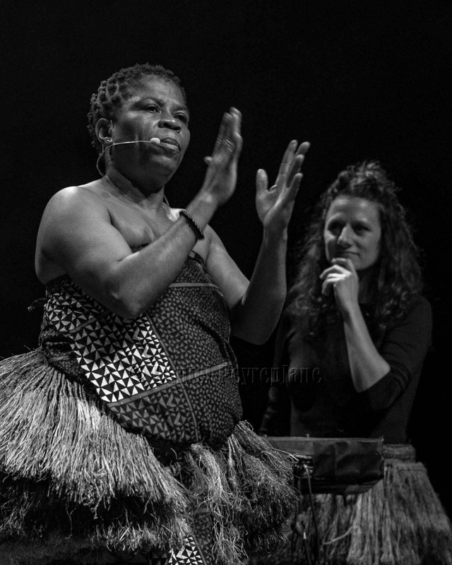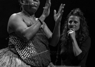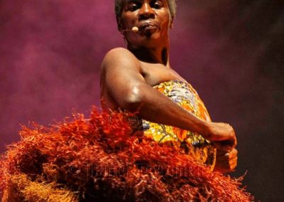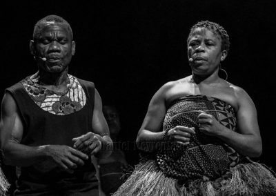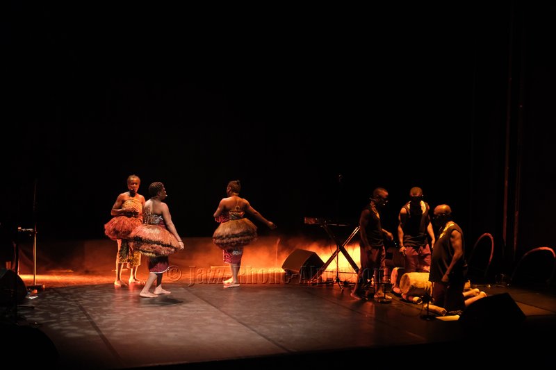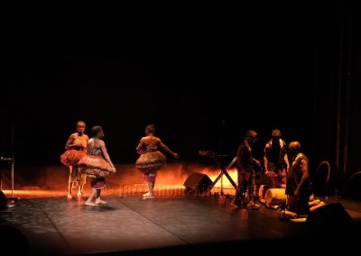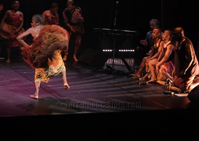 L’Ensemble Ndima (la Forêt en langue aka), créé il y a plus de vingt ans au Nord du Congo Brazzaville dialoguera ce soir avec Leïla Martial, Rémi Leclerc et Éric Perez, groupe occitan. Angélique Manongo, Émilie Koulé et Nadège Ndzabole, les trois chanteuses-danseuses du groupe du « peuple héritier » du Congo se présentent vêtues d’un pagne coloré et arborent une ceinture à trois étages composée de fils de tissu semblable au raphia. Les trois hommes percussionnistes-chanteurs, Gaston Motambo, Michel Kossi et Sorel Eto sont vêtus de costumes traditionnels. Leïla Martial sera aussi ceinte d’une ceinture de même type moins volumineuse.