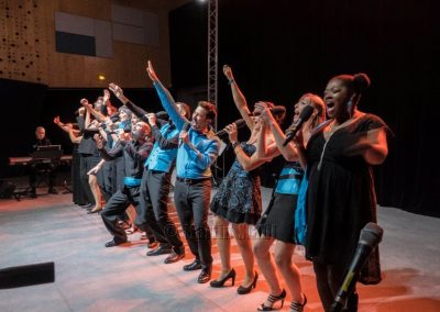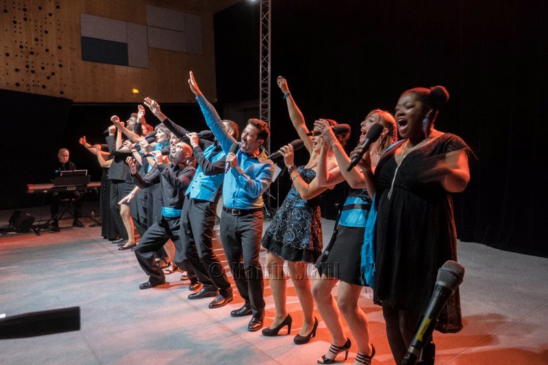 Leur ADN est le chant a cappella, notamment beaucoup pratiqué pendant le COVID, ce qui n’empêche pas aussi l’accompagnement du Trio musical: Pascal Andréis au piano, Dougie à la basse et Laurent Chofflet à la batterie.