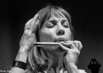 Parmi ces instruments il y a la voix d’Äulne. Voix aux multiples facettes, modulée en fonction de la respiration, du larynx, et qui se fond dans le groupe de façon mélodique ou percussive. Elle fait une démonstration impressionnante de ses capacités vocales dans le morceau O Ovo Un œuf d’Hermeto Pascoal donnant à entendre des poules en train de pondre en chantant !