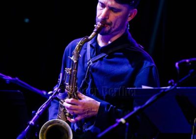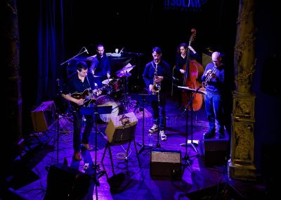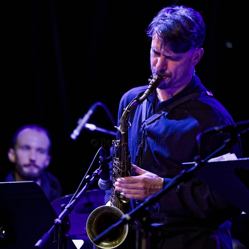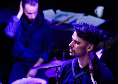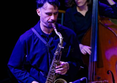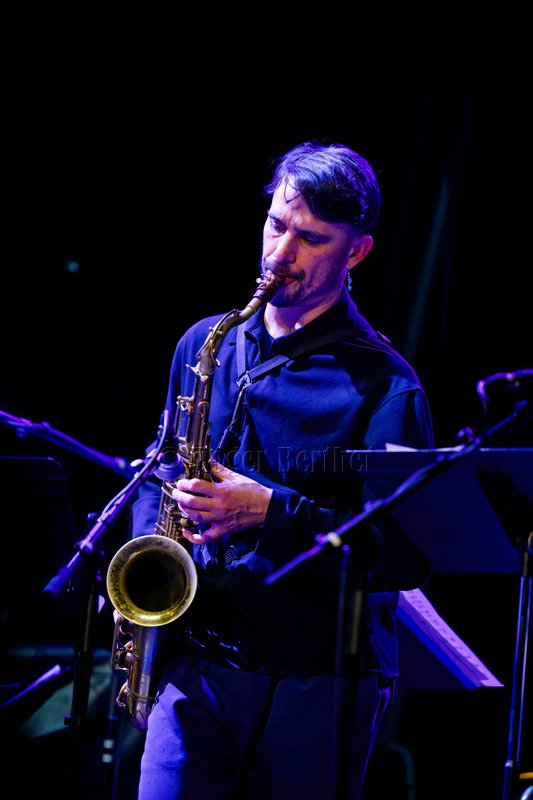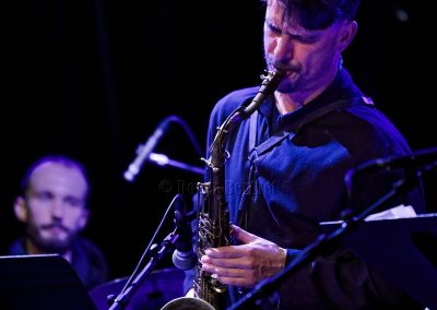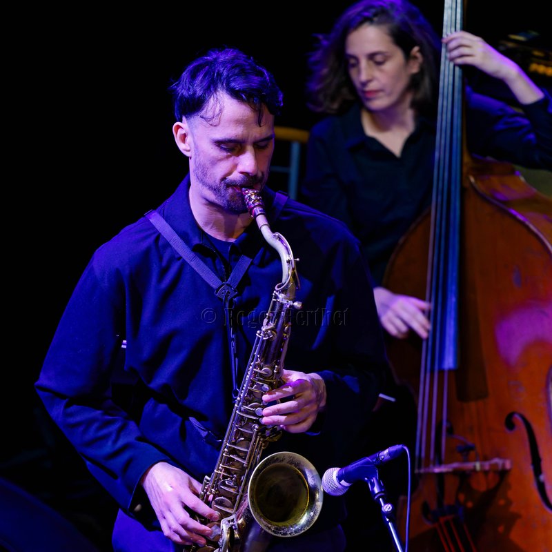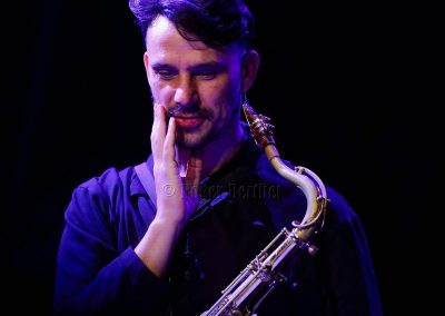 Mais revenons à la soirée. Une heure et quart de jeu pour « rendre hommage à la poésie du présent, un hymne à la nature ». C’est vrai que, d’emblée, le temps est palpable, comme un tutoiement entre l’instant et la présence, chacun étant à sa place et au service d’une toile sonore devenant de plus en plus figurative. La rythmique bien timbrée de la batterie et de la contrebasse confine souvent à la transe, mais sans exagération. Le ténor y ajoute des couleurs aux touches subtilement épicées et la trompette, excellente, est éveillée, curieuse, à l’affût. Dans ce jazz aussi actuel qu’accessible, c’est le vrai qui gagne, une vie qui s’ouvre en corolles et s’il y a parfois pléthore de sons mêlés, ce n’est jamais cacophonie, ni emprise d’un instrument sur l’autre. Dans cette jouissance du moment, la toile déborde et se fait sculpture, on a envie de caresser l’air. Il faut dire qu’on ne ressent pas de douleur dans cette musique, on y regarde des flocons tomber, des nuages passer, on y va au bal le dimanche ou on s’accroche à l’Espoir, titre du morceau en rappel.