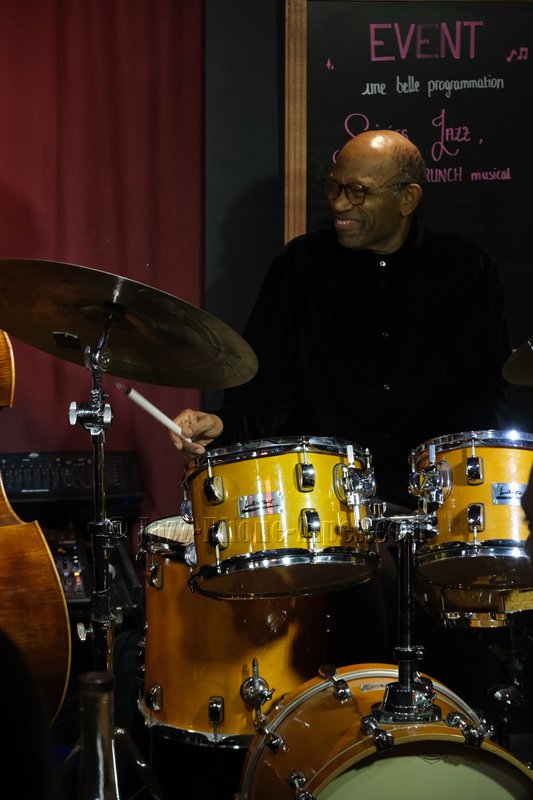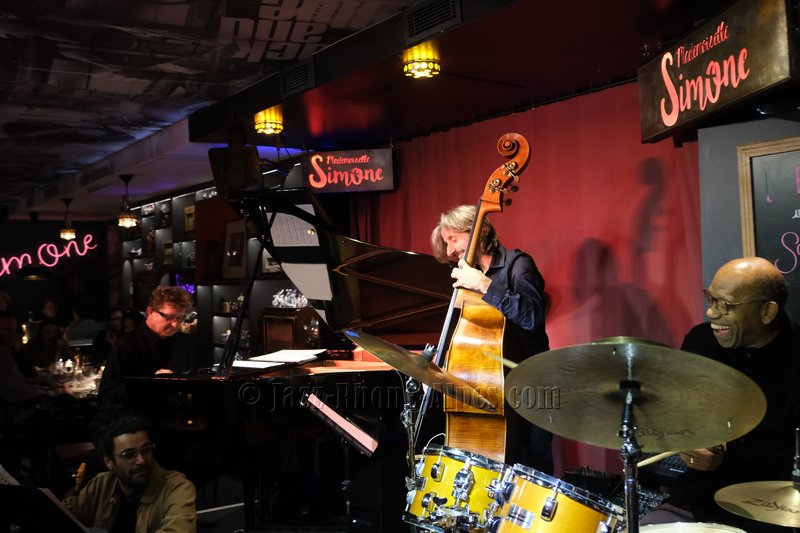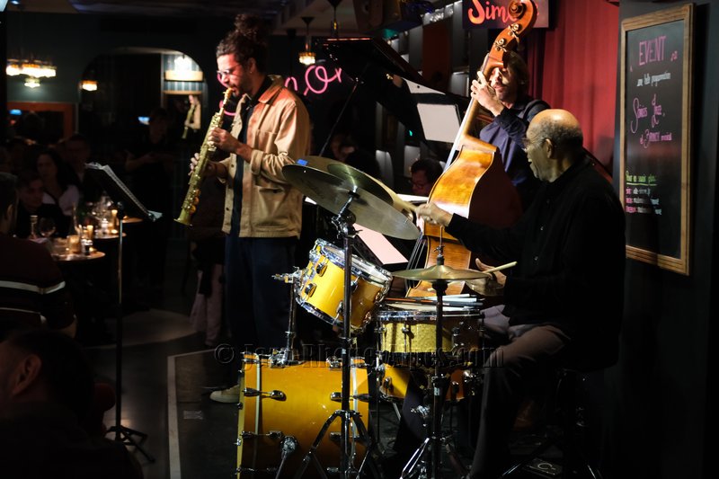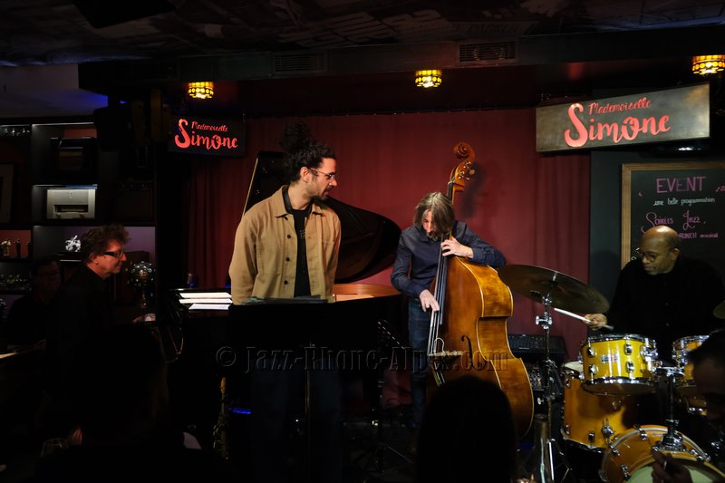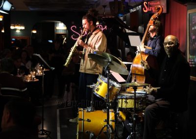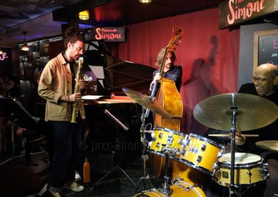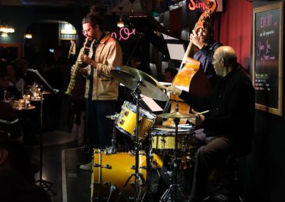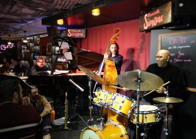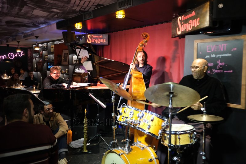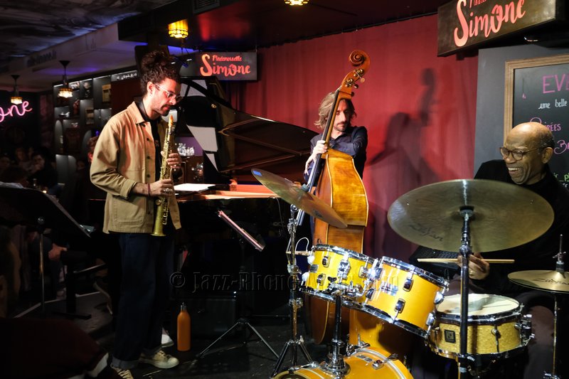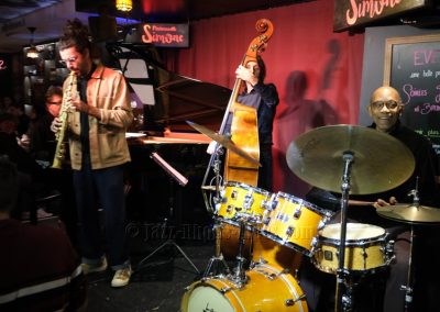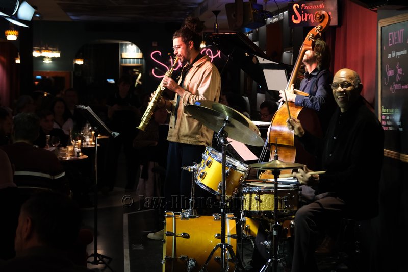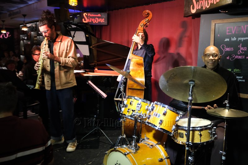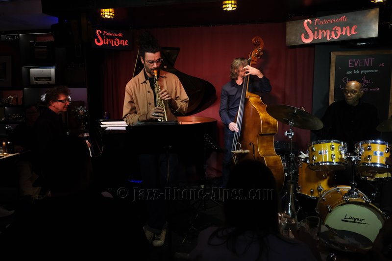 Sangoma Everett que l’on ne présente plus ici sait toujours s’entourer de musiciens talentueux et ce soir chez Mademoiselle Simone, il s’est adjoint les services du trop rare pianiste hongrois Emil Spányi et du saxophoniste soprano Renan Richard Kobel. A la contrebasse, l’incontournable Christophe Lincontang, plus de vingt ans de complicité avec le batteur. Un combo parfait pour une belle soirée de jazz.