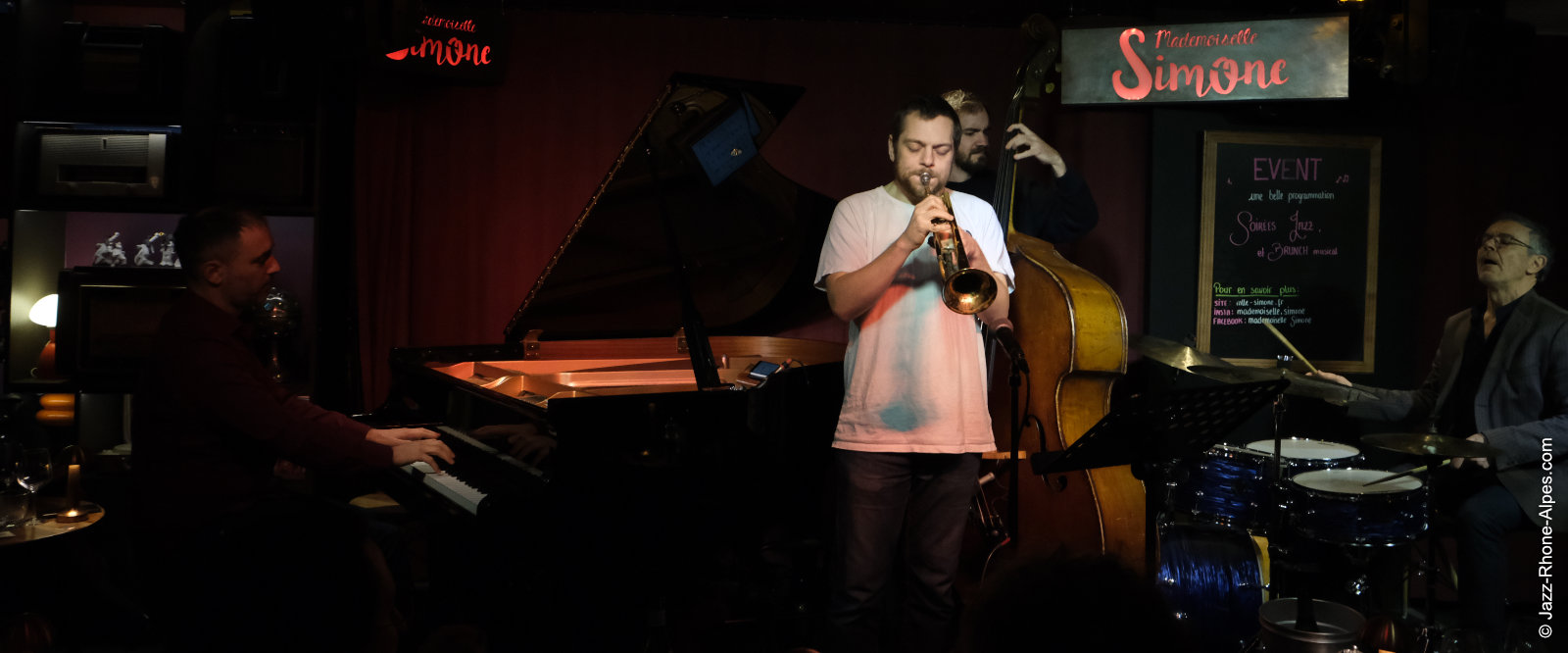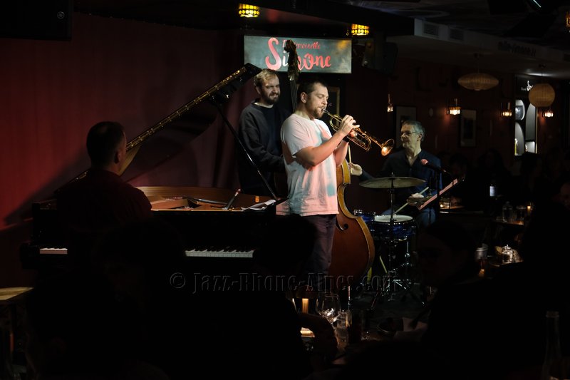 Symbiosis, c’est un quartet franco-anglais à l’initiative du pianiste Fabrice Tarel. Fort de ses connections avec le monde du jazz d’outre-manche, il s’est adjoint les services de la trompettiste Alexandra Ridout, du batteur anglais Andy Barron (et désormais rhônalpin depuis de nombreuses années) et du contrebassiste Cyril Billot. Ce soir, la trompette est tenue par le Londonien Mike Soper.