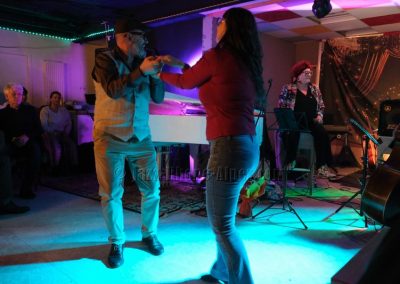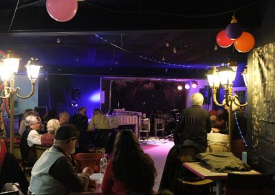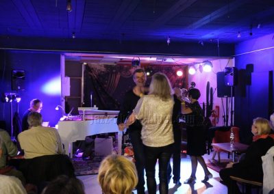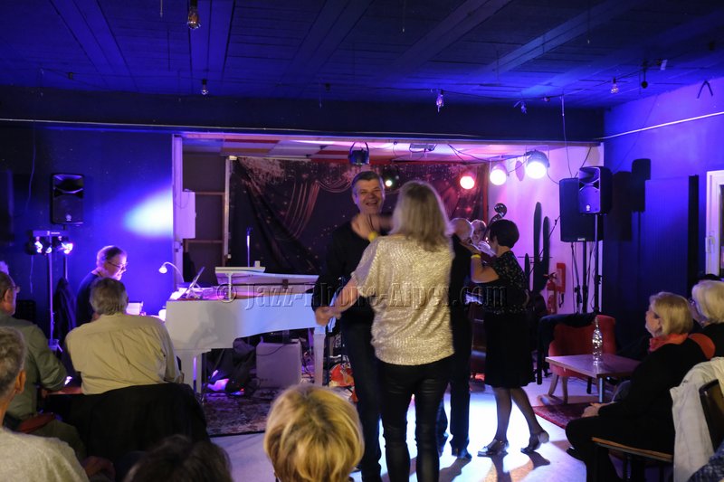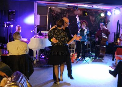 Les premiers couples de danseurs investissent la scène. Un bon niveau de balboa. Probablement des élèves de l’établissement (La Seiche propose des cours de tous types de danses de salon). Au rez-de-chaussée, pendant le concert de jazz à l’étage, une soixantaine de personnes suivent un cours de danse dominicaine, la bachata. La première partie se conclut avec un It Don’t Mean a Thing de rigueur.