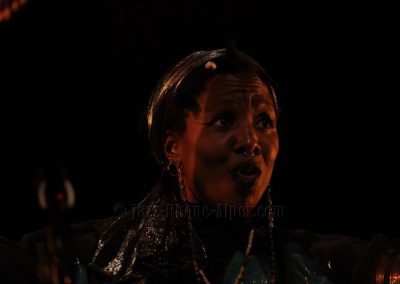 Cindy Pooch, Camerounaise, nous rejoint, avec ses gestes lents, vêtue d’une longue tenue noire recouverte d’un voile vert et doré, d’un large bandeau brillant sur les cheveux. Un fond sonore martèle « l’amour… l’amour… » tandis que Kiyémis nous déclame un poème, prière pour nos filles, nos fils, l’espoir de réparer…