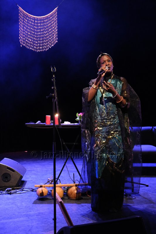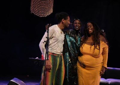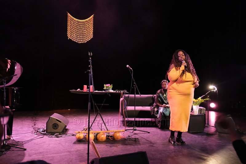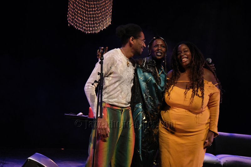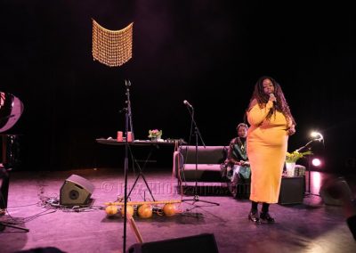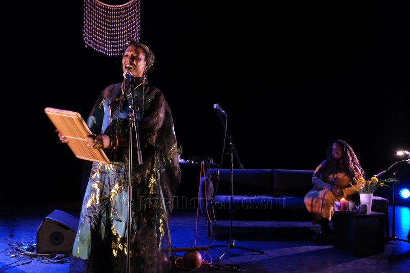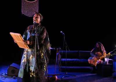 Elle sera accompagnée dans une scénographie avec canapé, table recouverte de bougies, bol chantant… de Kiyémis, d’origine camerounaise, blogueuse, autrice, afro-féministe française, engagée contre le sexisme, le racisme et la grossophobie et l’artiste, pianiste, chanteur Ariel Tintar. qui nous entraîne dans son voyage en paroles, en chants, en musique entre occident et Caraïbes, en français et en créole.