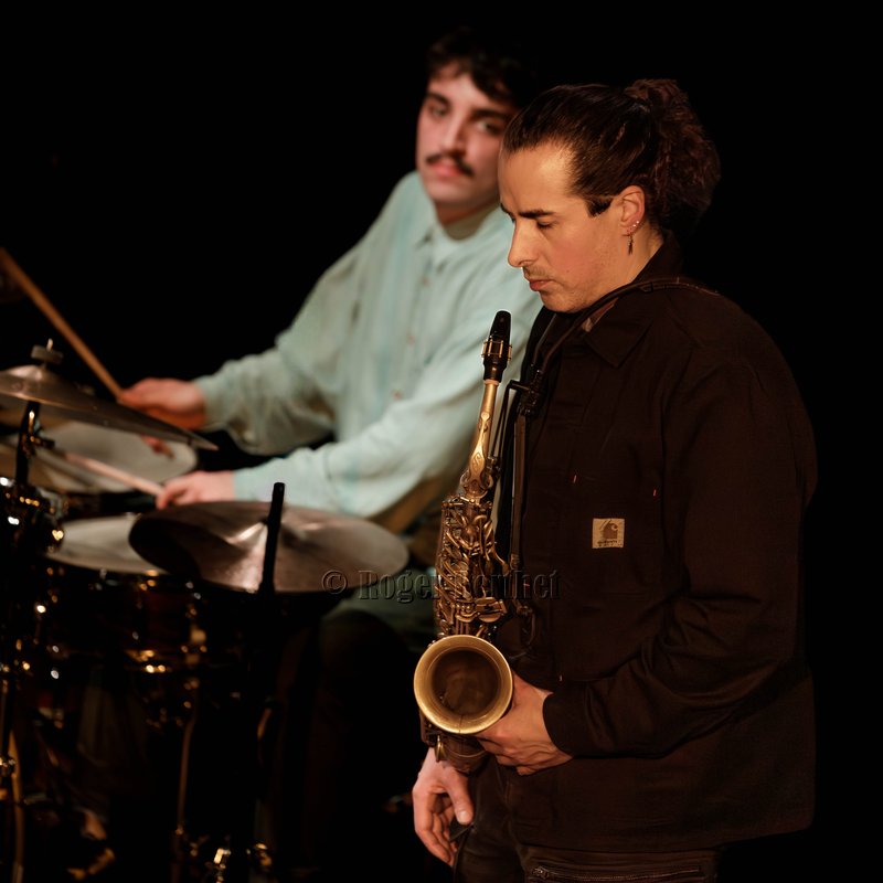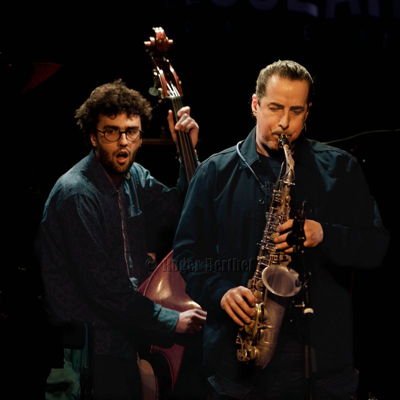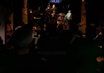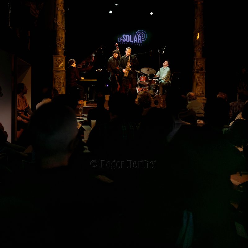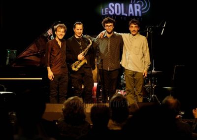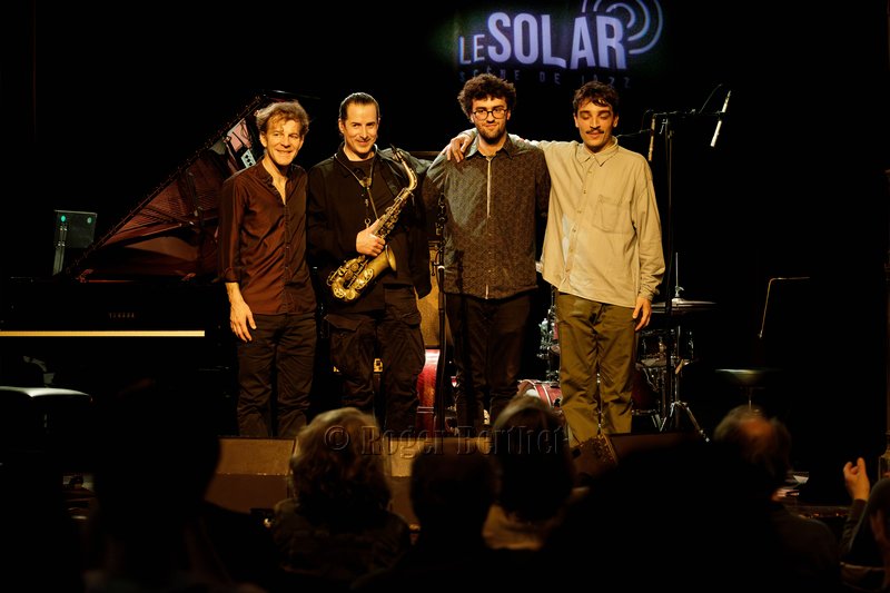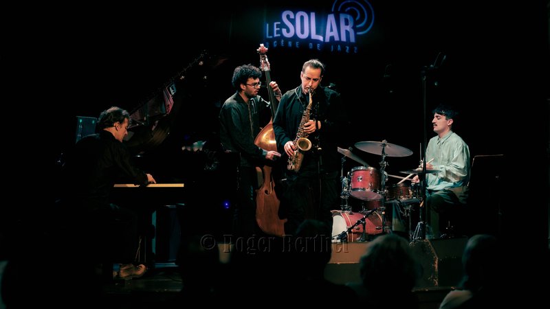 Des petits chanceux se rappellent l’avoir entendu en 2015 sur la péniche Sirius. C’était dans l’entrebâillement d’une vie qui avait mené Plume pendant deux mois à Lyon, entre son départ des States et son installation à Paris. Mais l’écouter vendredi au Solar, c’était plus que de la chance. C’était un rendez-vous comme on les aime, plein d’hypothèses à vérifier, d’obscurités à éclaircir et de questions en suspens. Car la plaquette d’annonce et les quelques infos glanées en amont laissaient planer un certain mystère. Qui donc se cache, s’il se cache, derrière ce vocable ailé ? Et pourquoi Plume au singulier ? Je ne sais toujours pas qui il est, l’homme impressionne par son côté serein et réfléchi… le bec dans l’eau me suis trouvée et, après tout, quelle importance… L’essentiel est ailleurs, dans une signature musicale unique. Le saxophoniste, « baigné tout jeune dans la musique» a passé ses premières années aux Etats-Unis. Quelques mots suffiront à dresser une carte de rêve: Boston, le Berklee College of Music, le New England Conservatory, le Wally’s Café, New-York. Quelques maîtres côtoyés aussi, de cette génération dont la pulse retentit encore dans le jazz d’aujourd’hui. S’il faut n’en citer qu’un, ce sera le sax ténor Walter Smith III, président du département des instruments à vent du Berklee College, figure majeure et auteur de la préface de Escaping the Dark Side, le premier album de Plume, publié en 2019. C’est à cette époque qu’il a fait irruption, éruption devrais-je dire, sur la scène française. Depuis, il a sorti Holding on (2022), volant en altitude et en formation(s). C’est le cas en cette soirée où le public est venu nombreux, peu à peu, emplir la salle. A ses côtés, se trouvent trois sacrés gus, dans le sens originel de « great ». Trois Parisiens venus d’ailleurs. Ce sont Leo Montana au piano, qui a grandi entre Bahia et la Guadeloupe. Gabriel Sauzay à la contrebasse, originaire de Bordeaux.