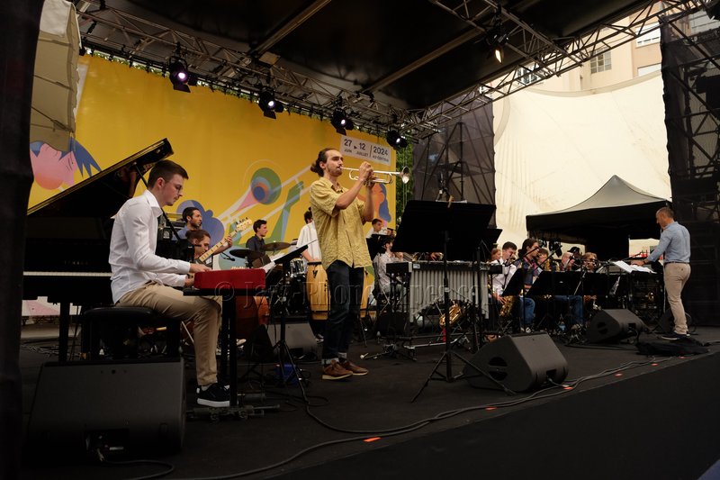 Le Big Band de l’INSA est placé sous la direction d’Hervé Salamone. A côté des étudiants deux musiciens professionnels sont venu faire des remplacements : Rodolphe Guillard (saxophone ténor) et Marc Chevallier (trompette)